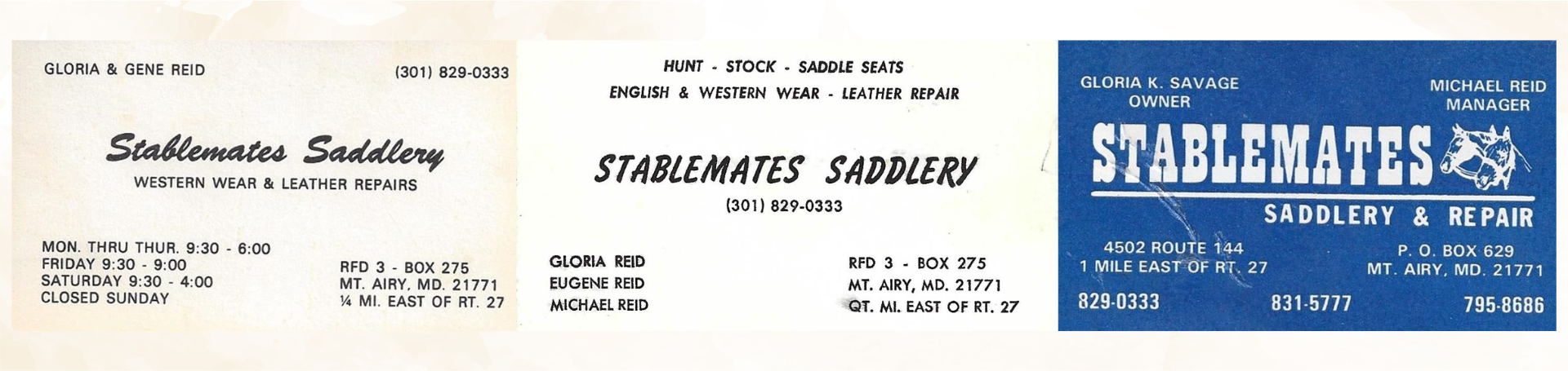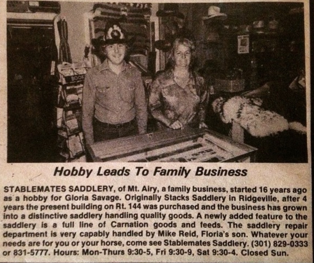 Born from a love of horses by two horsewomen, Stablemates Saddlery was opened by Gloria Reid and Helen Boyd in July of 1965 in the quaint little town of Mount Airy, Maryland. After a few years, Helen decided to leave the business to focus on her family, which made way for Gloria’s husband, Gene, a local barber and horseman, to join forces. Gene would become quite the tack repair specialist. Unfortunately in 1975, Gene passed away, which opened a door for his son Mike, to join the family business with his mother. The two worked hand in hand for several decades growing the hobby store into one of Maryland’s premier tack shops.